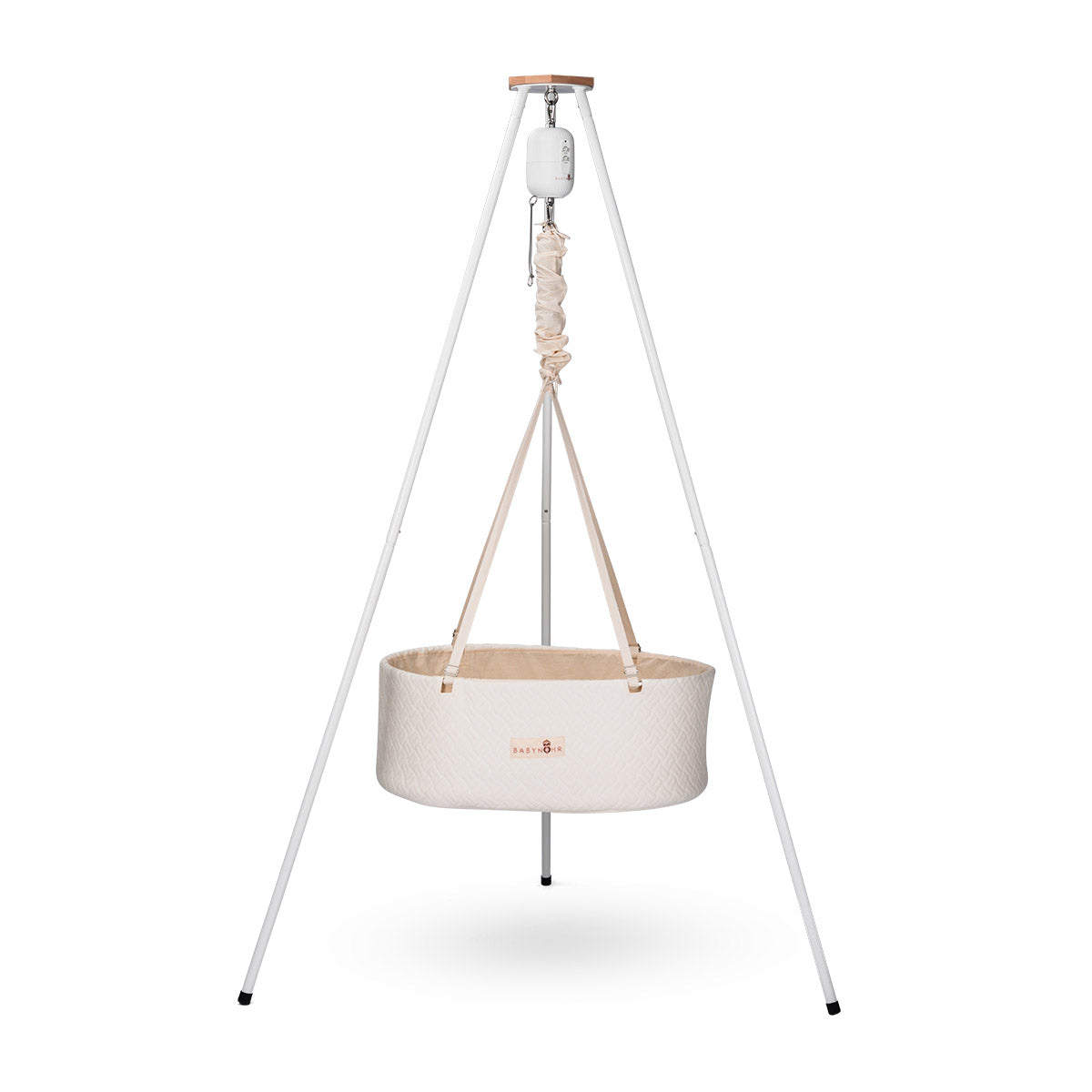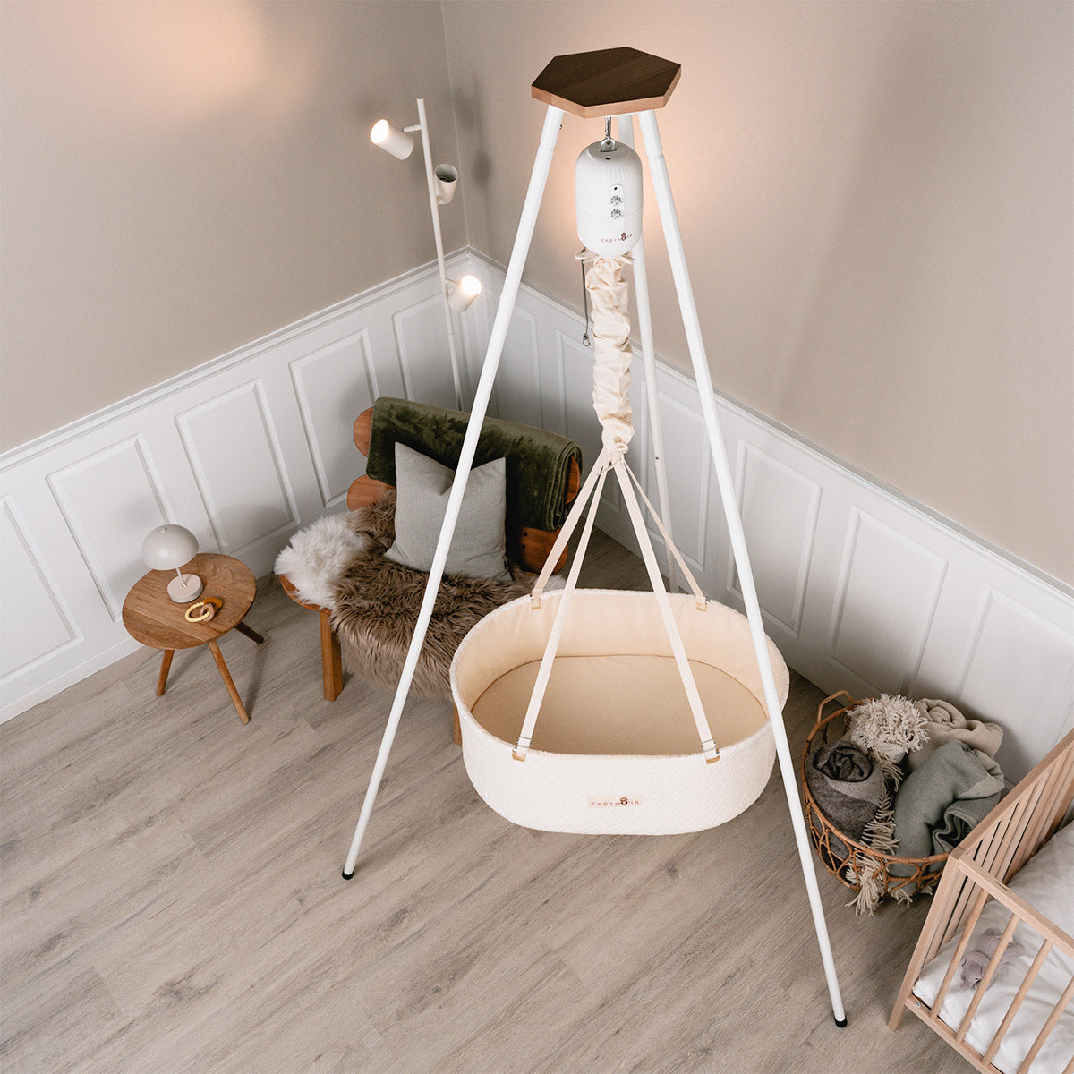 Den ovale hængevugge er et stilrent alternativ til den klassiske slyngevugge og kombinerer blide vuggebevægelser med en mere fast, rede-lignende form. Sammen med vuggemotorens rolige og gentagende bevægelser skabes et beroligende sovemiljø, der minder din baby om tiden i mors mave.
